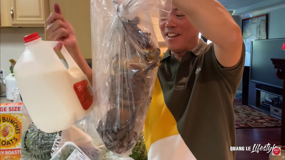 Bên cạnh đó, Quang Lê cũng mua cả những đồ ăn đậm chất Việt Nam như gạo, đậu hũ, rau đắng, khổ qua, bầu, nấm, măng chua, tần ô, đậu que… Trong các bữa ăn tại Mỹ, nam ca sĩ thường nấu món Việt.