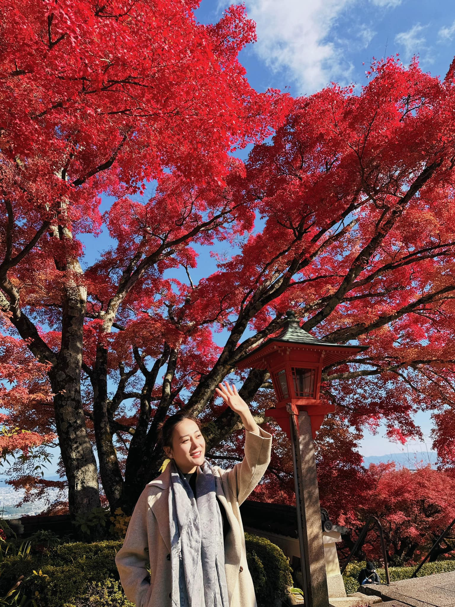 Phương Oanh rạng rỡ dưới hàng cây lá đỏ Nhật Bản.